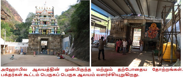 இந்தப் பகுதியில் அஹோபில க்ஷேத்திரத்தில் எந்த எந்தக் கோயில்கள் உள்ளன, எங்கு உள்ளன, அந்தத் தலங்களின் விக்கிரஹங்கள் எப்படி இருக்கின்றன என்பதைச் சுருக்கமாகப் பார்க்கலாம். வெறும்ன, இந்தக் கோவிலுக்குச் சென்றேன், அடுத்தது அந்தச் சன்னிதிக்குச் சென்றேன் என்றால் அவற்றின் முக்கியத்துவம் தெரியாமல் போகலாம். அதனால் theory portionக்குத் தயாராகுங்கள்.  இணையத்தில் https://sivatemple.wordpress.com/ என்ற தளத்தில் பழைய புகைப்படங்களைப் பார்த்தேன். அவற்றில் சிலவற்றையும் உபயோகித்திருக்கிறேன். (நான் பெரும்பாலும் மூலவர் புகைப்படங்களை எடுப்பதில்லை. ஆனால் படங்களைப் பார்த்தால்தான் நாம் சேவித்த திருத்தலங்கள் நினைவுக்கு வரும். அதிலும் நவ நரசிம்ம க்ஷேத்திரங்களையும் இரு நாட்களில் தரிசித்துவிட்டு, எந்தக் கோவிலில் நரசிம்மர் எந்த வடிவத்தில் இருந்தார் என்பதே நினைவில் இருக்காது. அந்த ஒரு காரணத்துக்காகவே இணையத்தில் கிடைத்த படங்களை இங்கு பகிர்கிறேன்). மேல் குறிப்பிட்ட தளத்தில் எழுதியிருப்பதைப் படித்த எனக்கு தற்போதைய அஹோபிலத்தையும் அதன் வளர்ச்சியையும், புராதானத்தையும் இன்னும் தெளிவாகப் புரிந்துகொள்ள முடிந்தது. யாம் பெற்ற இன்பம் மற்றவர்களும் பெறட்டுமே.