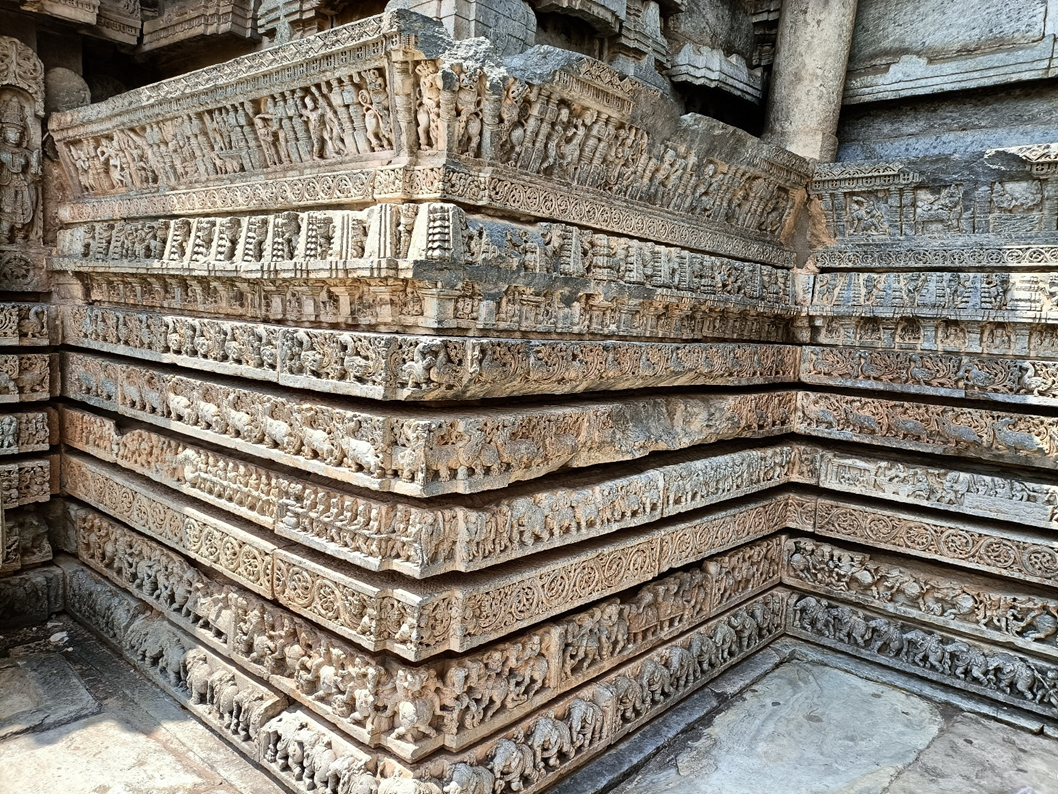ஹோய்சால கோயில்களில் மாத்திரம் சுவர், மற்றும் கோபுரங்கள் என்று ஒரு இடம் பாக்கி வைக்காமல் சிற்பங்களால் நிறைந்திருக்கும். இது கோயில் சாதாரணமாக கட்டிமுடித்தபின் சுவர்களிலும் கோபுரத்திலும் செதுக்கினார்களா அல்லது சிற்பங்கள் செதுக்கப்பட்ட ஒரே அளவு கற்களை அடுக்கி சுவர் எழுப்பினார்களா என்பதைப் புரிந்துகொள்ள முடியவில்லை.