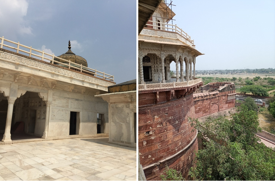 ஜஹானாராவின் அரண்மனையை ஒட்டி உள்ள பகுதியில்தான், அரசர் வெளிப்புறமாக நின்று (யமுனை ஆற்றின் பகுதி) காலையில் தரிசனம் தருவார். இது பல காலமாக நடக்கும் ஒரு நிகழ்வு. பொதுமக்கள் (குறிப்பாக பிராமணர்கள்-இப்படித்தான் வரலாற்றில் எழுதியிருக்கிறது) காலையில் குளித்த பிறகு அரச தரிசனம் செய்ய அந்தக் கரையில் வருவார்கள். அரசரைப் பார்ப்பது கடவுளைப் பார்ப்பது போல என்பது ஐதீகம். இது ஔரங்கசீப் காலத்தில்தான், சுத்த பைத்தியக்காரத்தனமான ஐதீகம் என்று சொல்லி நிறுத்தப்பட்டது. அது நிகழ்ந்த இடம் முதல் படம். அதை ஒட்டித்தான் அறுகோண வடிவில் வெள்ளைப் பளிங்கில் ஷாஜஹான் அரண்மனை உள்ளது. அதன் வெளிப்புறம் பால்கனி போல, பளிங்குத் தூண்களுடன் உள்ளதை இரண்டாவது படத்தில் காணலாம். அங்கு நின்றுகொண்டு பார்த்தால் தாஜ்மஹல் தூரத்தில் தெரியும்.